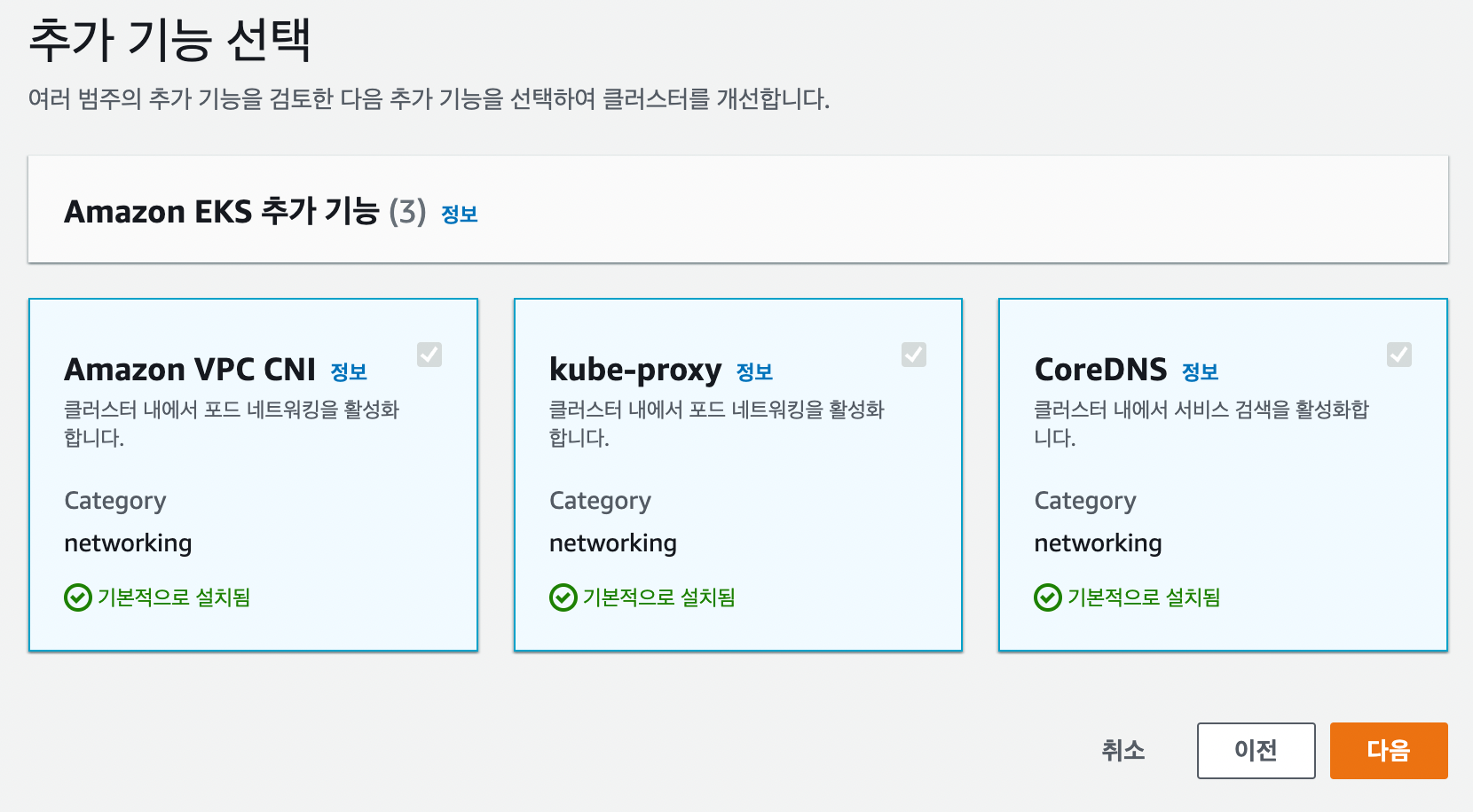 EKS에서 기본으로 제공하는 추가 기능을 선택할 수 있다. 3개 모두 선택하고 다음 버튼을 클릭한다.
