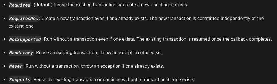 이 외에도 Spring 표준처럼 6가지의 전파 설정을 제공하고 있다. (그러나 직접 확인해보니 NotSupported는 제대로 동작하지 않는 듯...)