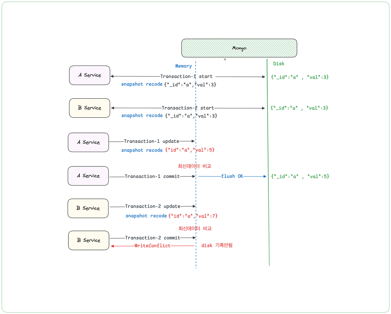 MongoDB는 여러 트랜잭션이 같은 리소스를 동시에 수정하면 RDB처럼 작업이 순서대로 실행되지 않고 쓰기 충돌(Write Conflict) 오류를 발생시킨다. 그러나 개발자들이 @Transactional()에 기대하는 일반적인 동작은 RDB에서 사용할 때 처럼 쓰기 충돌 오류를 발생시키지 않고 작업을 반영하는 것이다.