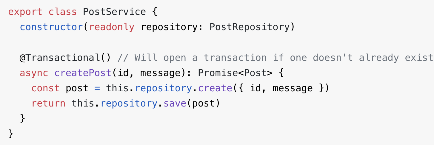 NestJS에서도 RDB를 사용할 때 TypeORM을 쓰면 @Transactional()을 사용해 Spring과 똑같이 원자성을 부여할 수 있다.