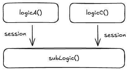 두 함수 logicA()와 logicB()는 내부 로직에서 subLogic()이라는 다른 함수를 호출하여 DB 명령을 수행한다. subLogic()은 현재 context의 트랜잭션에 합류할 수 있도록 상위 call stack에서 전달한 session을 DB 명령에 포함시킨다.