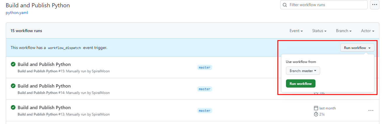 버튼 클릭으로 실행할 것이기 때문에 on 트리거를 workflow_dispatch로 지정했다. 실행환경을 ubuntu-latest로 설정하고 환경변수 PYPI_API_TOKEN을 불러오도록 했다. 그리고 python 3.9 버전에서 빌드를 실행하도록 했다.