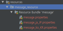 다른 언어로 된 리소스를 추가해보자. 형식은 파일명_언어코드_국가코드.properties 이다. 이렇게 지어주면 클라이언트가 한국어 리소스를 요청(Locale 객체가 ko_KR)했을 때 messageSource가 알아서 message_ko_KR의 내용을 읽어들인다. 파일명은 전부 같게 해주자.