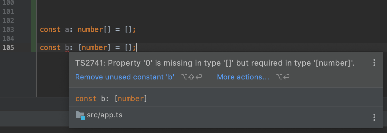 두 번째, 타입을 [] 괄호의 안쪽에 선언. 사실 이건 number 요소가 1개로 고정된 배열, 즉 튜플이다.