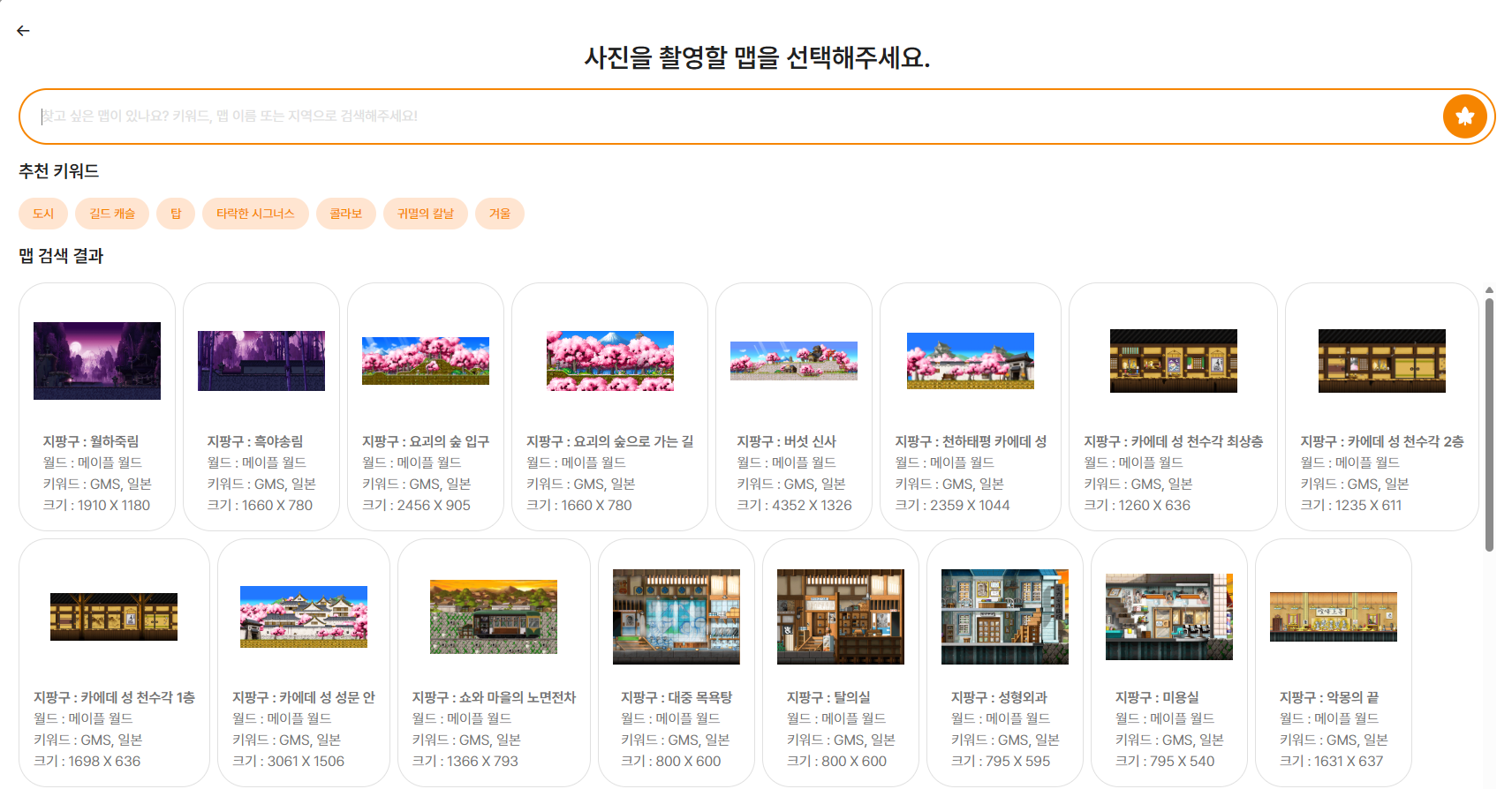 - 메이플스토리 게임 내의 맵을 배경으로 선택할 수 있어야 할 것 (직접 업로드한 이미지를 배경으로 사용할 수도 있음)