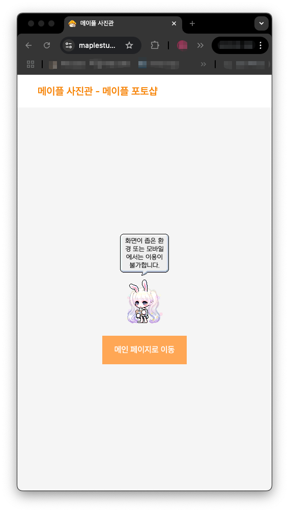 그동안 메이플 사진관은 모바일 이용자를 위해 웹사이트를 반응형으로 개발했지만, 이번 포토샵 기능의 경우 예외적으로 모바일 또는 브라우저의 width가 좁은 환경에서는 부득이하게 서비스를 이용할 수 없도록 했습니다.