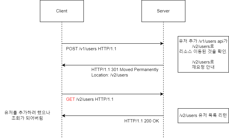 서버는 클라이언트에게 HTTP 상태코드와 함께 새로운 URL을 제공하여 다시 request를 보낼 것을 명시적으로 알린다. 클라이언트는 새로운 URL로 다시 request를 보낸다.