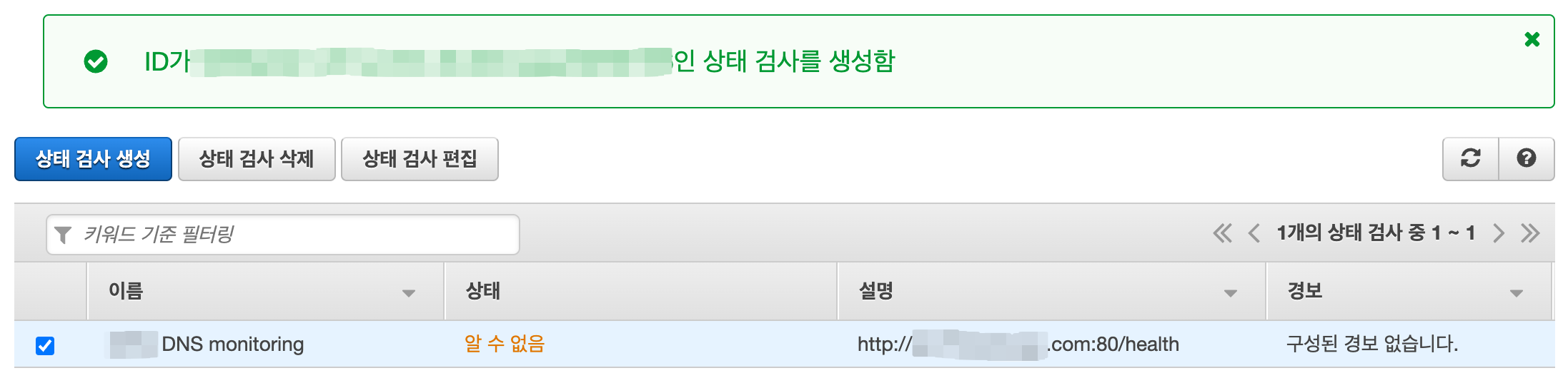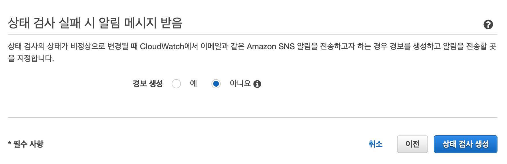 경보 생성은 나중에 별도로 연결할 예정이니 아니오를 선택하고 상태 검사 생성 버튼을 클릭한다.