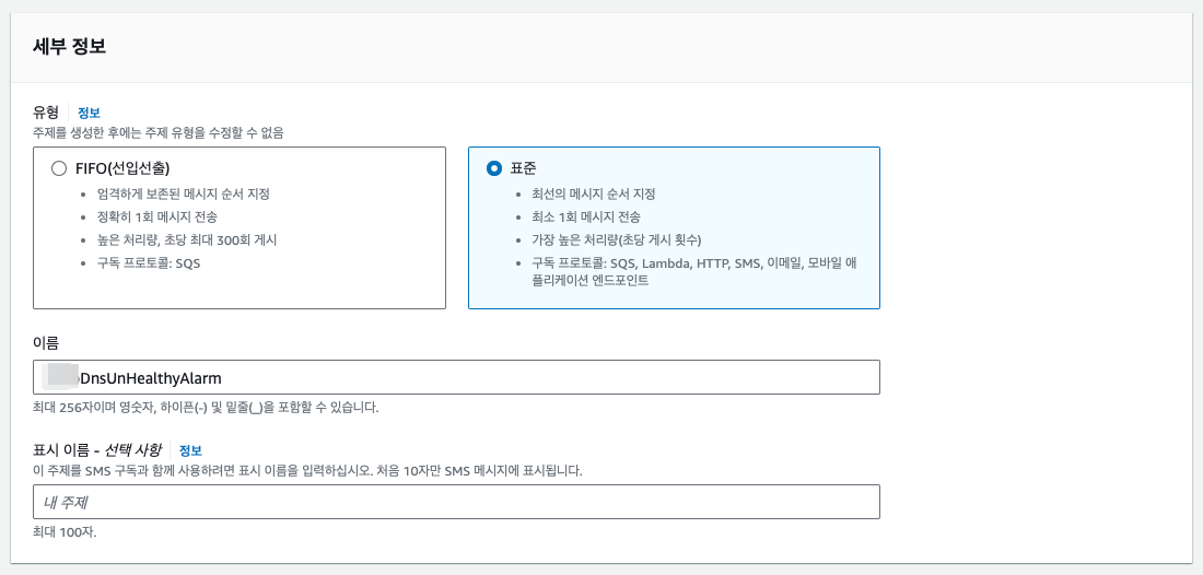 유형은 표준으로 선택하고 주제 이름을 지어준다. 주제 생성 버튼 클릭