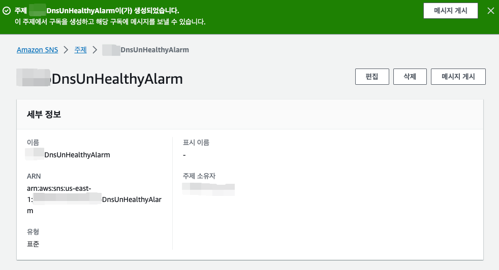 SNS 주제가 만들어졌다. 이제 CloudWatch에 연결할 수 있는 상태가 되었다.