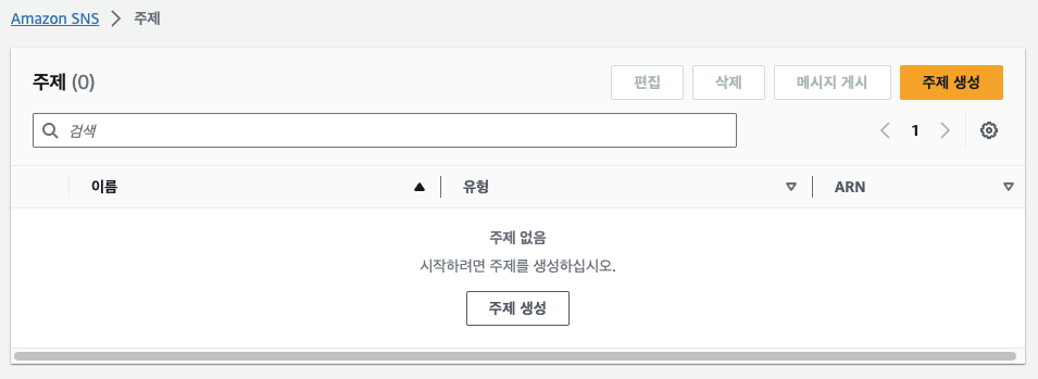 us-east-1 리전의 SNS 페이지에서 접속하여 주제 생성 버튼을 클릭한다.
