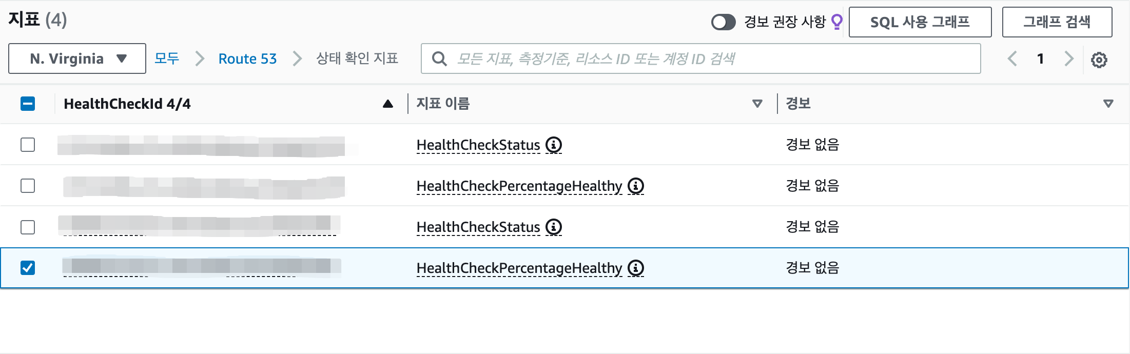 그래프로 표시된 지표 탭에서 HealthCheckPercentageHealthy 레이블을 선택하고 지표 선택 버튼을 클릭한다.