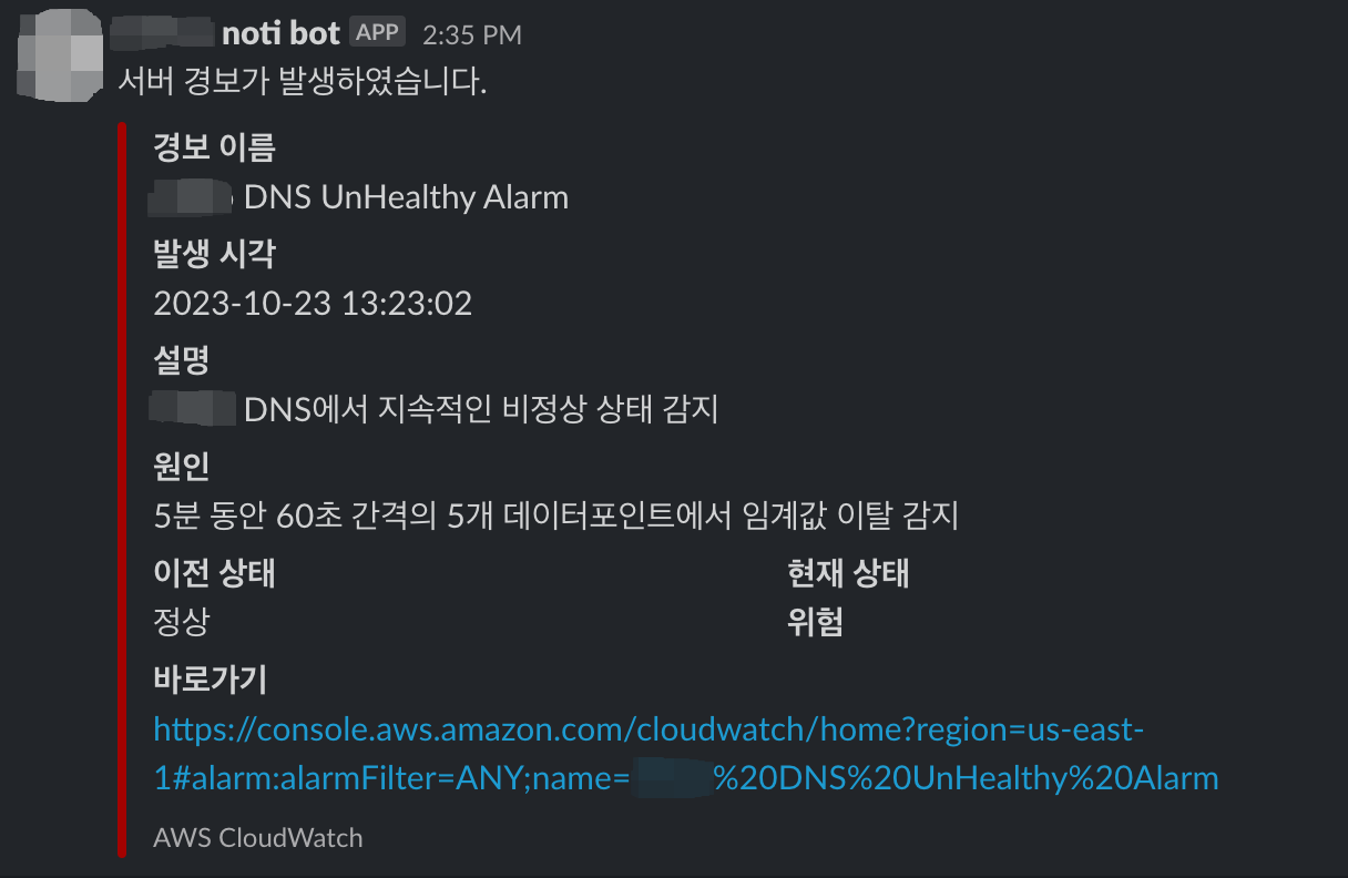 CloudWatch가 감시중인 HealthCheckPercentageHealthy 지표에서 임계값을 이탈하면 CloudWatch는 SNS로 신호를 전달하며 해당 SNS를 구독중인 Lambda가 경보 메시지를 전달받아 가공하여 Slack으로 최종 전달하게 된다.