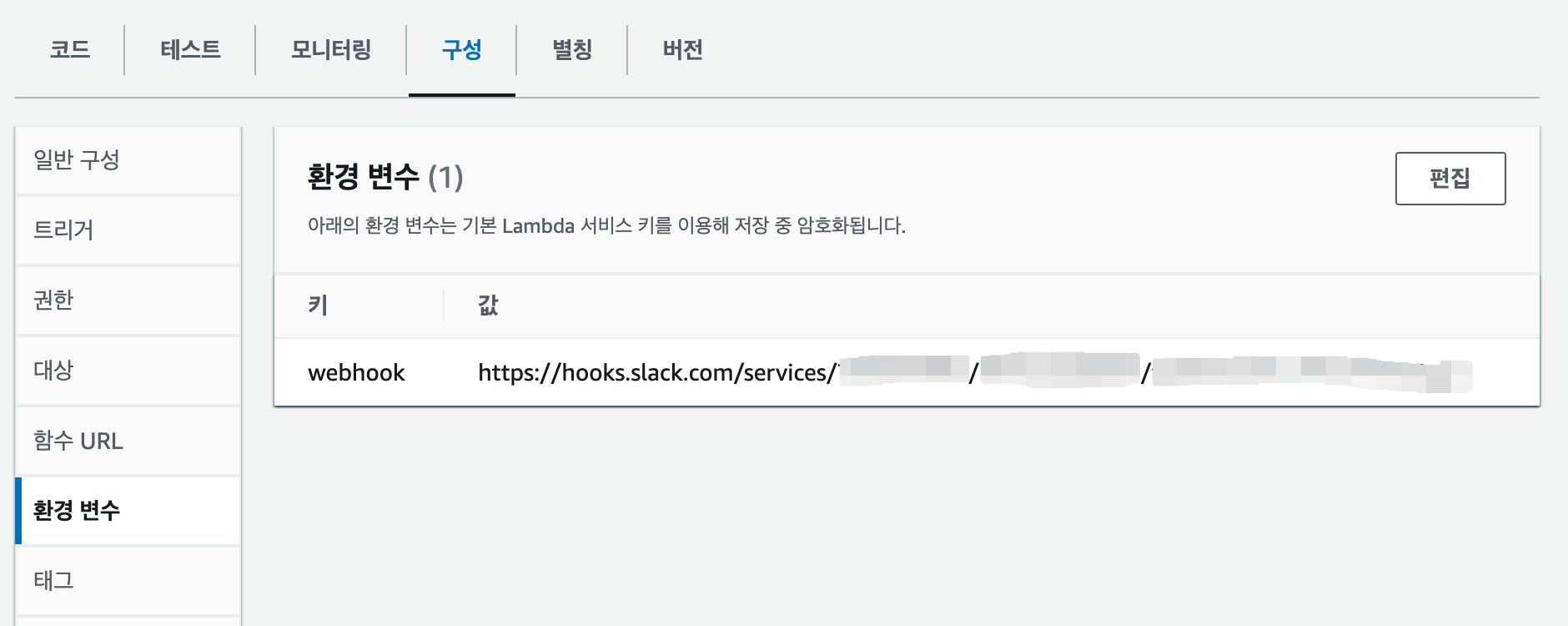 구성 탭으로 돌아와서 환경 변수를 편집해야한다. 사전에 미리 발급해둔 Slack webhook URL을 환경 변수로 추가해준다.