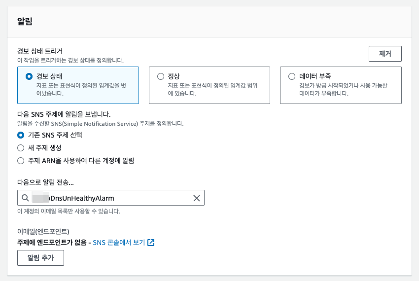 엔드포인트의 비정상 상태를 알리기 위한 경보이므로 트리거 조건은 경보 상태로 선택하고 경보 알람은 아까 만들어두었던 SNS를 선택한다.