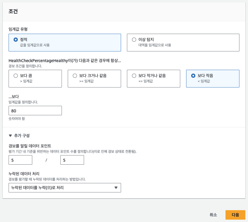 임계값 유형을 정적으로 선택하고 임계값은 80으로 지정한다. 경보 조건은 < 임계값으로 선택한다.
