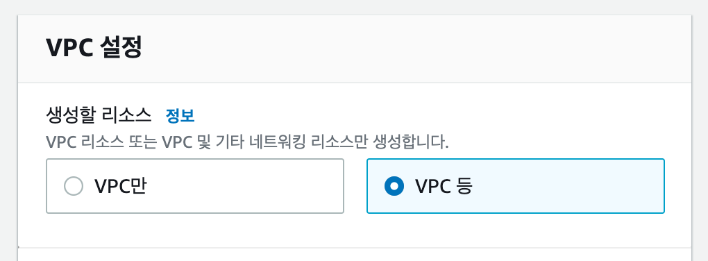 VPC와 subnet, 라우팅 테이블, 게이트웨이를 모두 생성하고 자동으로 연결할 것이라면 "VPC 등"을 선택한다.