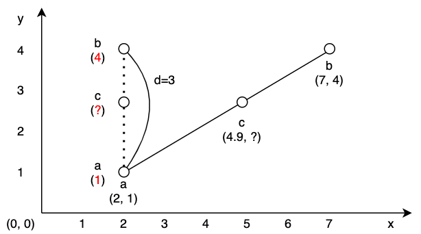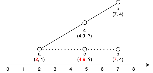 위 사진을 보면 점 a와 b가 양쪽에 있고, 그 사이에 점 c가 있다. a와 b의 좌표는 각각 (2, 1)와 (7, 4)로 미리 알고있는 상황이며 c는 a와 b사이의 어느 한 지점이라는 점만 알고 있다.