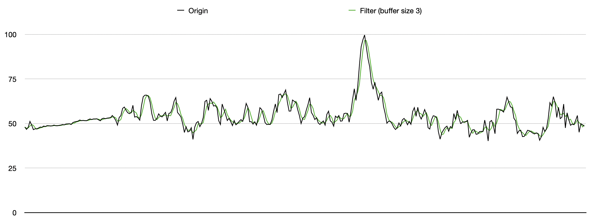 버퍼의 사이즈를 늘려주면 더 완만해진 데이터로 필터링 할 수 있다.