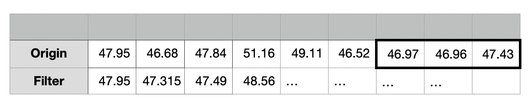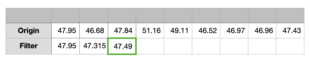 표족하게 튄 원본 데이터에 비해 필터링된 데이터는 변화량이 비교적 완만해진 것을 볼 수 있다.