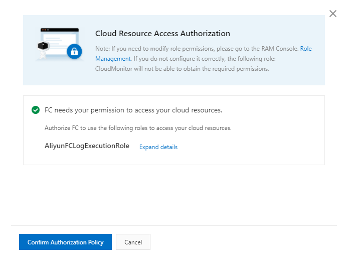 만약 Function Compute를 처음 설정한 것이라면 위 사진과 같이 "Cloud Resource Access Authorization" 동의 화면이 나온다. Confirm 버튼을 눌러주자.