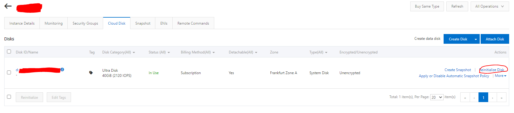 인스턴스가 중지되면 Reinitialize Disks 가 활성화 된다. Reinitialize Disks 클릭하여 디스크 정보 화면으로 넘어가자.