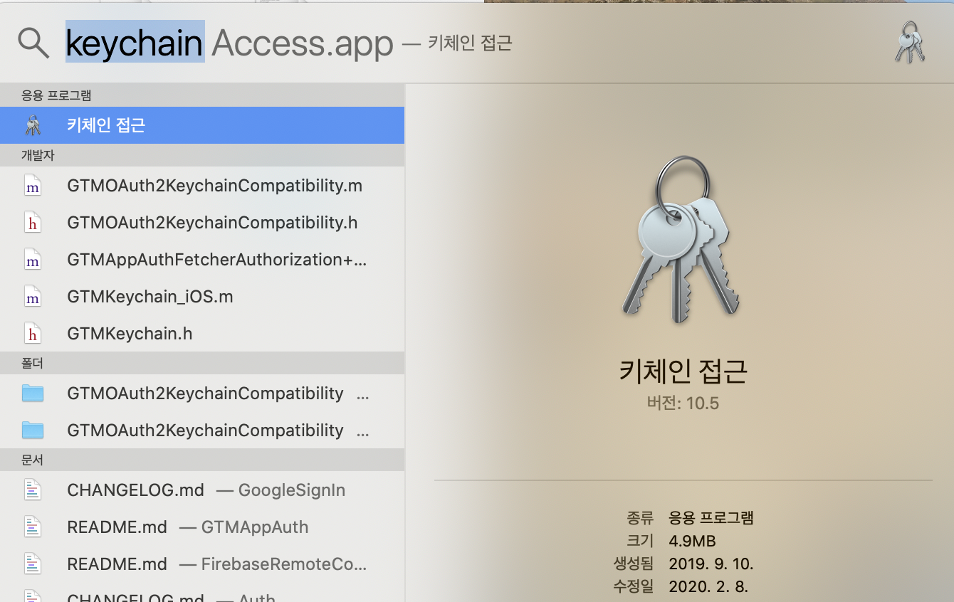 Command와 Space를 눌러 키체인접근을 실행.