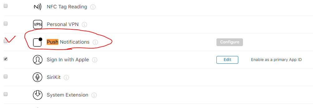 Push Notifications을 체크하고 저장한다. Configure는 여기서 할 필요 없으니 무시.