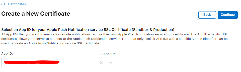 이 인증서가 어느 App ID에 적용될 것인지 선택한다. 푸시 알림을 적용할 iOS App ID를 선택하고 Continue 클릭.