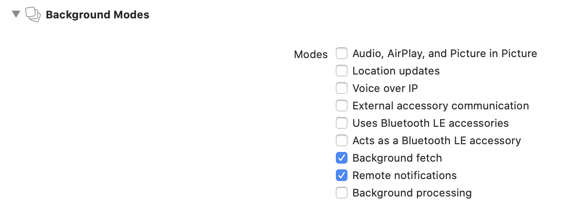 Background Modes에선 "Background fetch"와 "Remote notifications"를 활성화 한다.