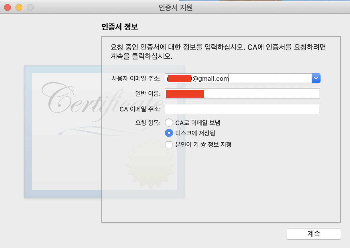 본인의 이메일을 작성하고 "디스크에 저장됨"을 선택하고 "계속" 클릭.