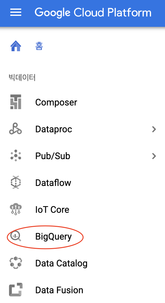 홈 탭의 빅데이터 항목에서 "BigQuery"를 찾아 클릭