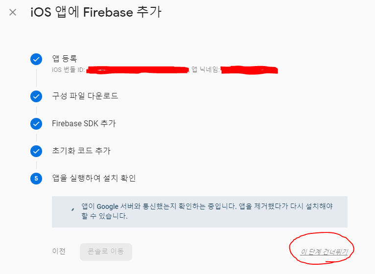 여기까지 진행했다면 파이어베이스 프로젝트에 iOS 앱이 성공적으로 등록된 것이다.