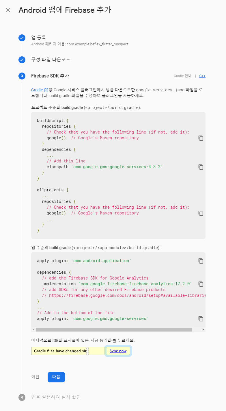 네 번째 단계는 앱을 빌드했을때 프로젝트에 성공적으로 파이어베이스 의존성이 설치되었는지 검증하는데, 필수 과정이 아니므로 넘어가자.
