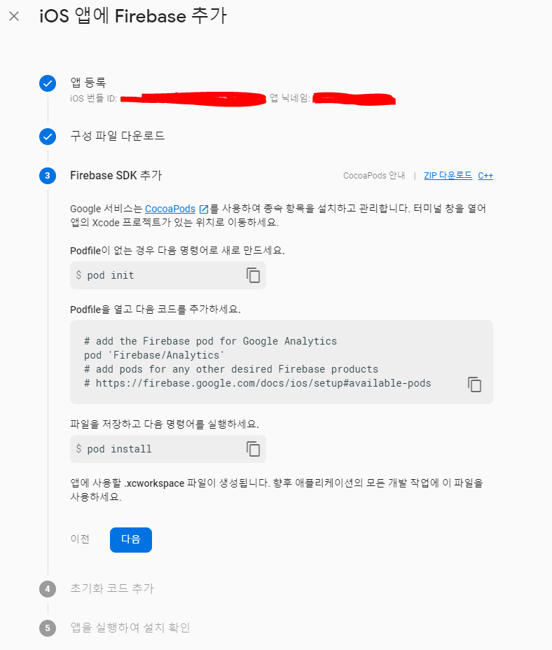 첫 번째 단계에서는 iOS 프로젝트의 Bundle ID와 앱 닉네임(파이어베이스 콘솔에 보여질 이름), 앱스토어 ID 등을 입력한다.