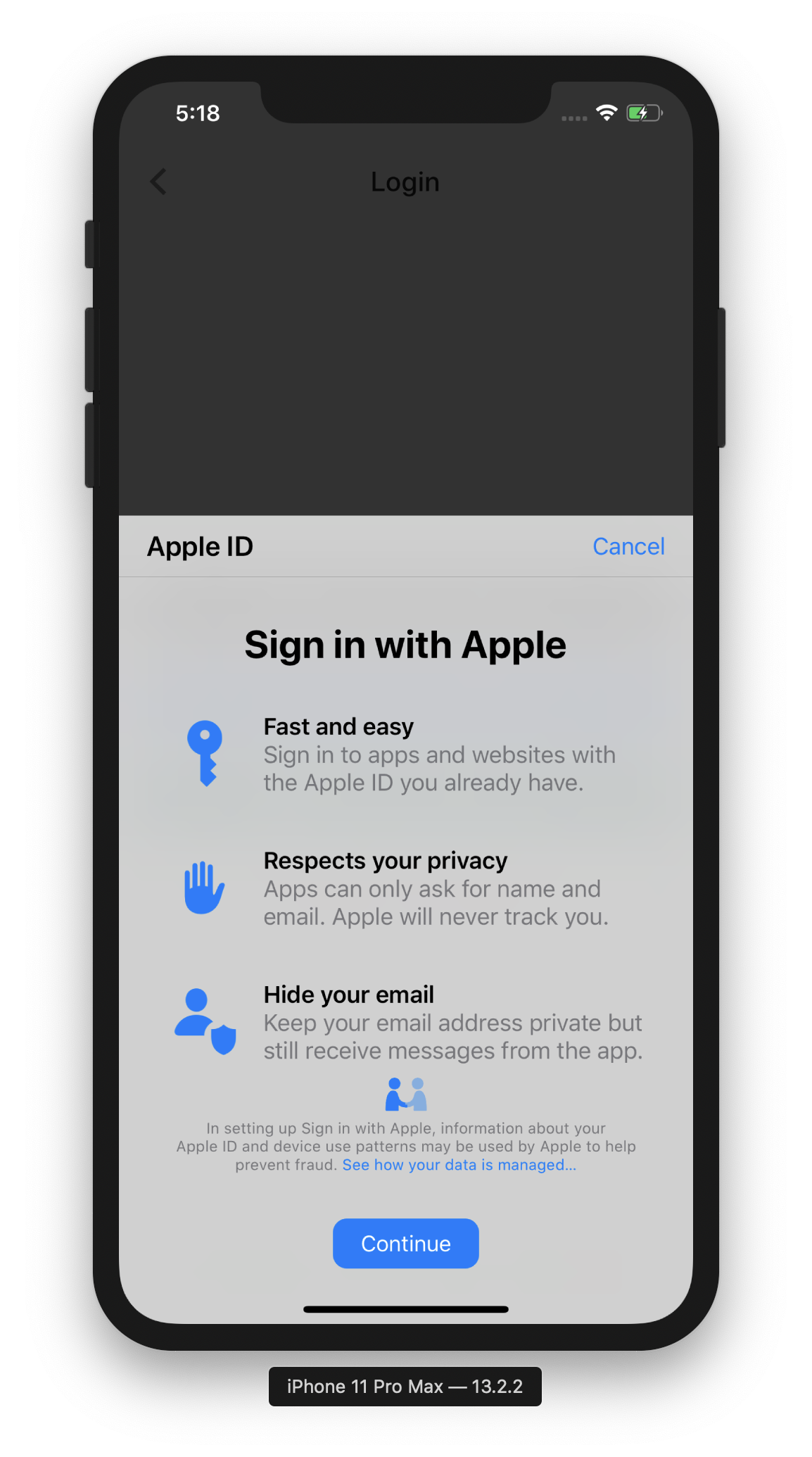 그럼 위와 같은 UI가 나타난다. 대충 애플 로그인에 대해 소개하는 화면인듯... Continue 터치.