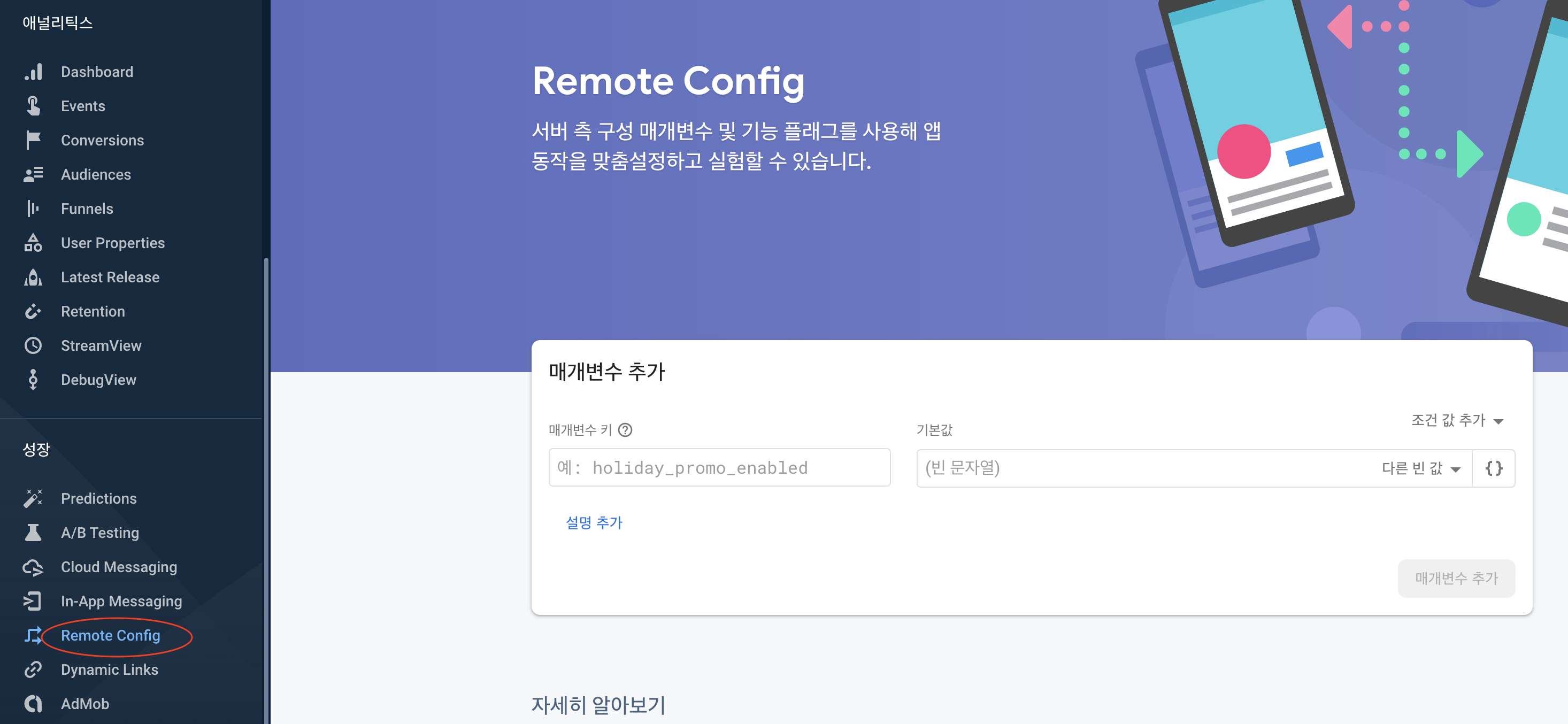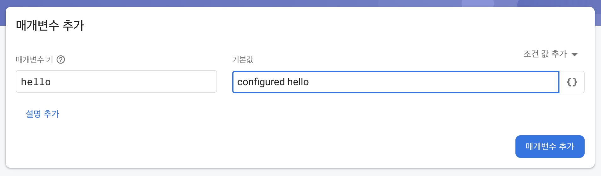 웹 파이어베이스 프로젝트 페이지의 Remote Config 탭으로 들어간다. 여기서 원격 구성 데이터를 설정하면 사용자에게 변경된 값이 전달되는 것이다.