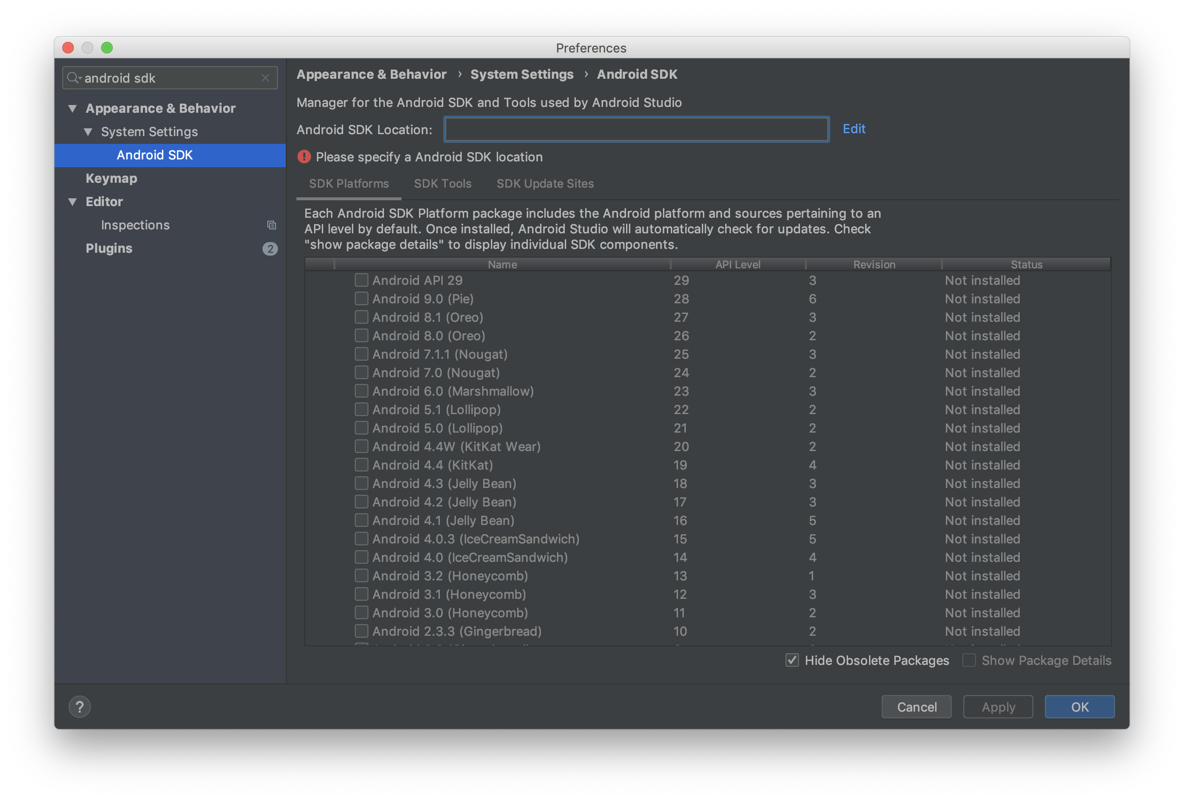 다행스럽게도 플러그인을 설치하면 SDK까지 자동으로 설치해준다. (SDK는 웹사이트에서 직접 다운받는 것도 가능)