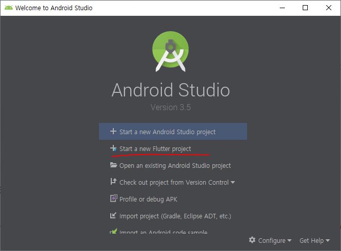 메뉴에 Start a new Flutter project가 생겼다! 눌러보자.