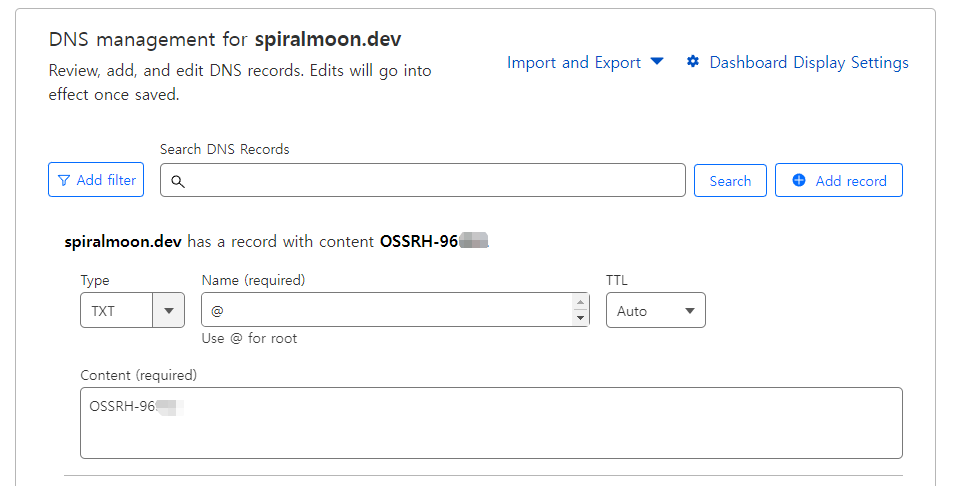 요약하자면 이슈를 등록할 때 입력했던 도메인(Group Id)의 DNS records에 특정 레코드를 추가하라는 내용이다.