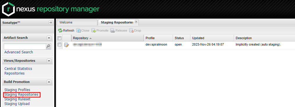 좌측의 Staging Repositories 클릭하여 대시보드에 접속한다. 방금 전에 github actions를 통해 빌드된 패키지가 이 곳에 표시된다. (느려가지고 바로 표시가 안될 수 있음)