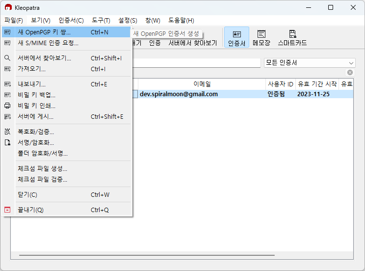 새 OpenPGP 키 쌍 메뉴 클릭