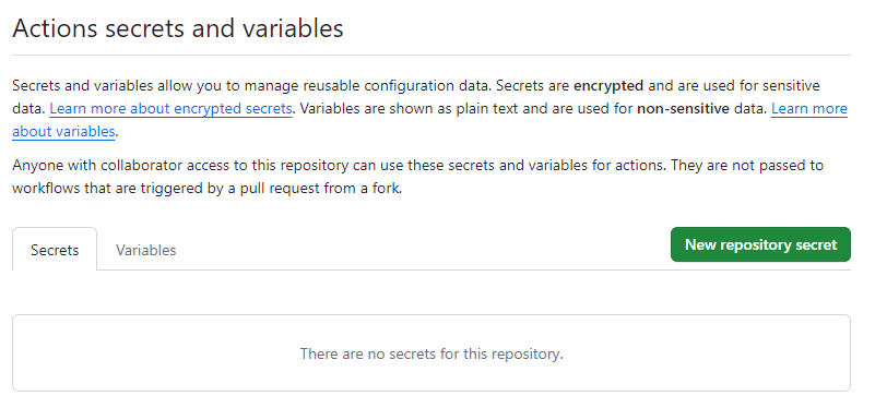 이 곳에서는 Github Actions Workflow에서 사용할 환경변수를 만들 수 있다. New repository secret 클릭