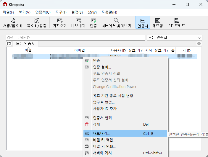인증서를 우클릭하여 내보내기와 비밀 키 백업을 실행한 뒤 공개키와 비밀키를 파일로 저장한다.