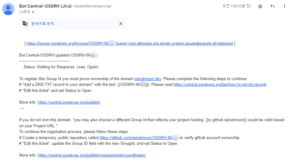 - Sonatype Jira에 이슈 등록 및 도메인 소유권 인증