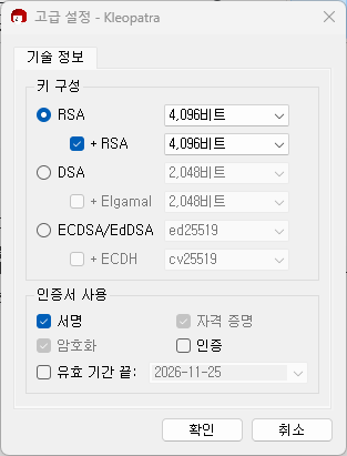 인증서의 암호화 방식을 선택하고 하단의 서명 옵션을 활성화한다. 인증서의 유효기간을 커스터마이징 할 수 있는데 한 곳에 박아두고 계속 쓸거면 기간 설정을 하지말자.