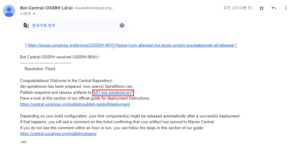 Maven central repository에 업로드 하기 전 단계인 Nexus repository manager를 사용할 수 있게 되었다는 내용이다. 사진에 빨간 박스로 표시된 주소(s01.oss.sonatype.org)가 본인이 사용할 Nexus repository manager의 주소다.
