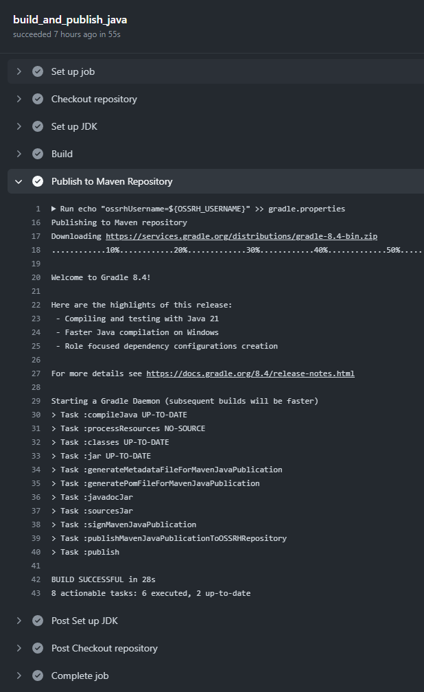 버튼 클릭으로 실행할 것이기 때문에 on 트리거를 workflow_dispatch로 지정했다. 실행환경을 ubuntu-latest로 설정하고 환경변수 OSSRH_USERNAME, OSSRH_PASSWORD, GPG_SECRET_KEY, GPG_PASSPHRASE를 불러오도록 했다. 그리고 JDK의 버전을 지정해주었다.