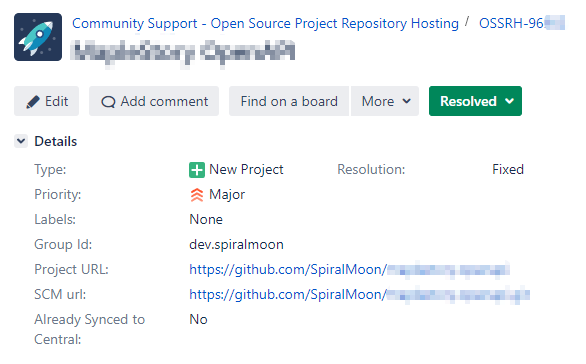 다시 이슈 페이지를 확인하면 상태가 Resolved로 변경된 것을 확인할 수 있다. Nexus repository manager를 통해 Maven central repository로 Group Id가 일치하는 패키지를 업로드 할 수 있게 되었다.