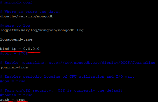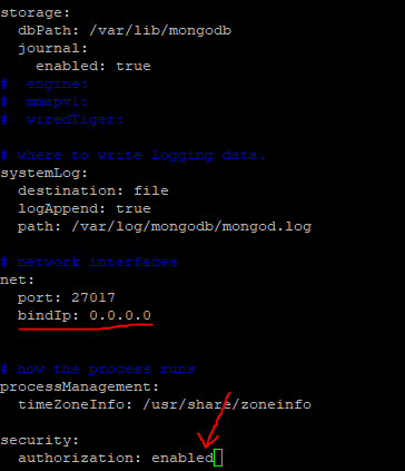 bindIp를 0.0.0.0으로 설정 해주고 security 속성 하위에 authoraization을 enabled 상태로 설정한다.